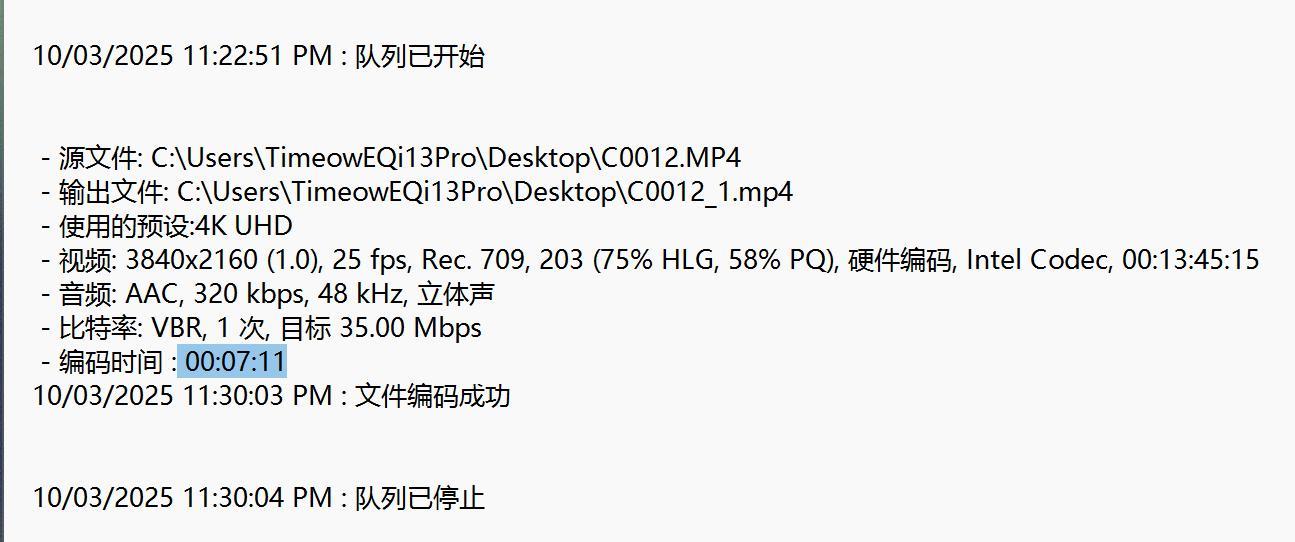 接着来看一下视频转码,使用Adobe Media Encoder 2025对一个用索尼A7R2拍摄的、13分多钟、H264格式、100Mbps的4K视频转码,目标格式为H265(HEVC)、35Mbps、4K(预设4K UHD)。