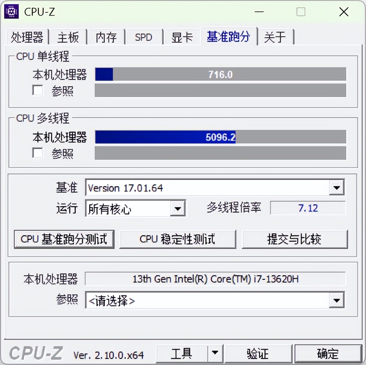 EQi13 Pro的CPU-Z跑分如上,单核716、多核5096: