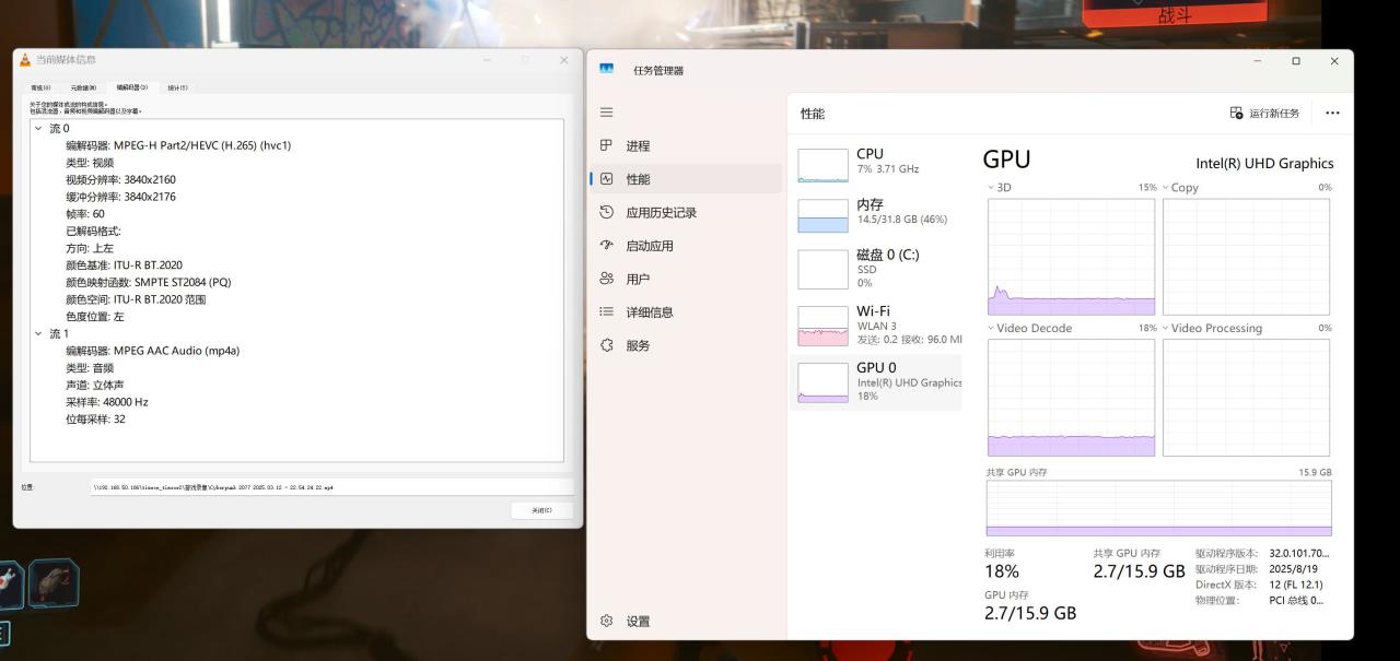 我使用VLC播放器,播放一段HEVC格式的4K分辨率自录游戏视频。