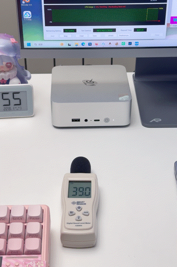 此时,CPU满载的情况下,分贝仪显示噪音仅为39分贝左右。